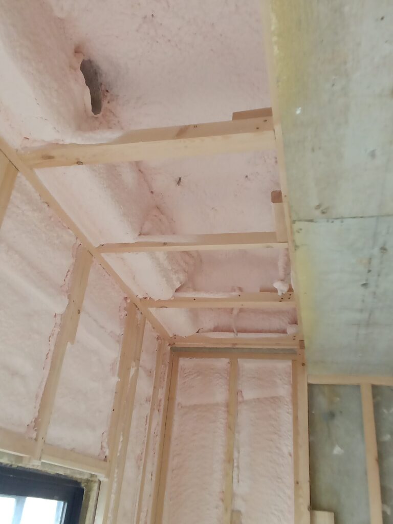 今回は吹付工事で、もこもこと膨らむ発泡断熱を施工しました。