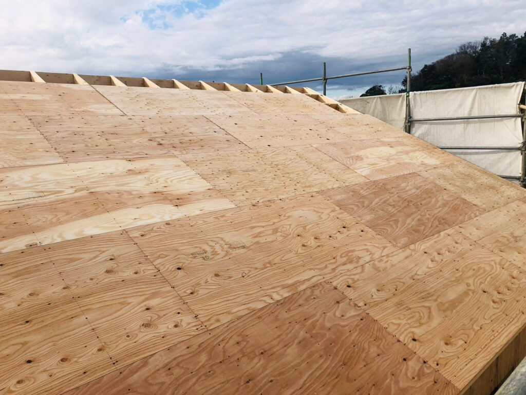 ↑ 小屋組、野地板張り(もう少しで上棟)(^^♪
