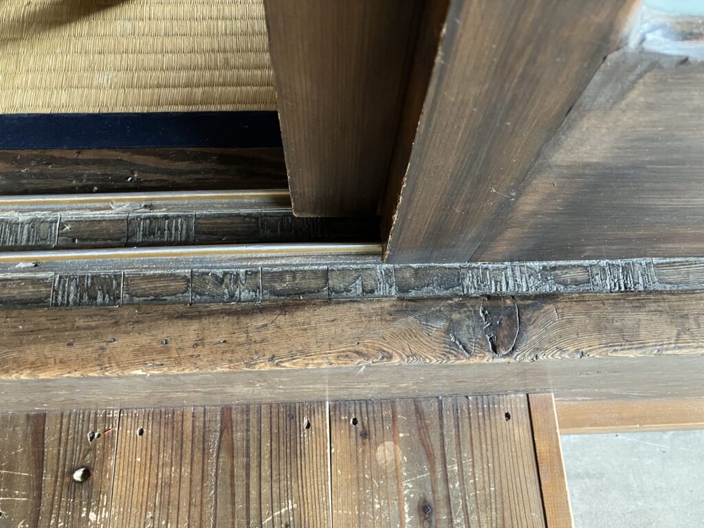 敷居の埋木とは、溝の部分に、摩耗に対する耐久性を上げるため、予め敷居より硬い材料を貼り付けたり、襖や障子が長年動くことで、敷居の溝が擦り減ったり、欠けたりした場合、この摩耗部分に新しい木を埋木して修復するといった方法です。