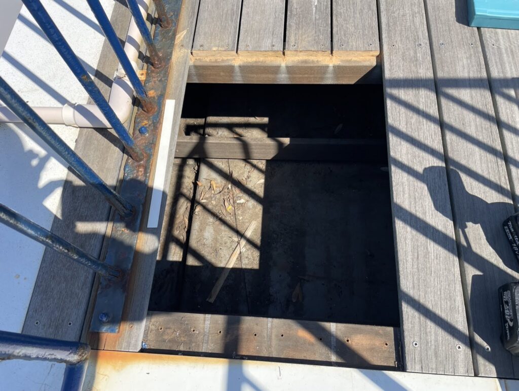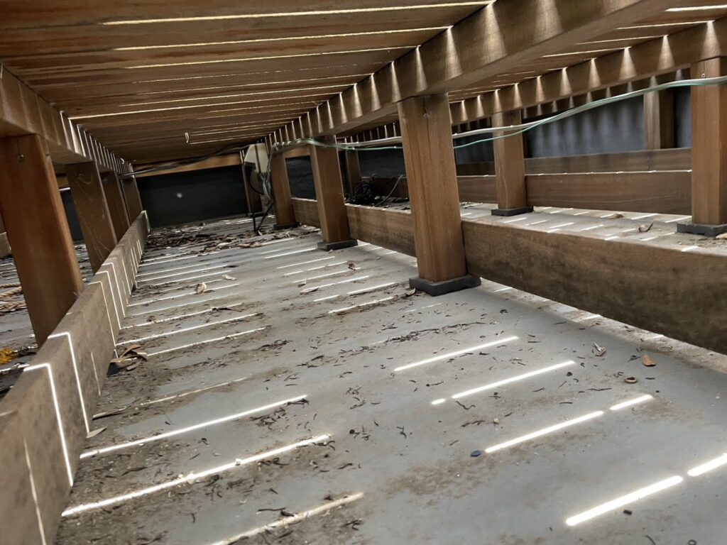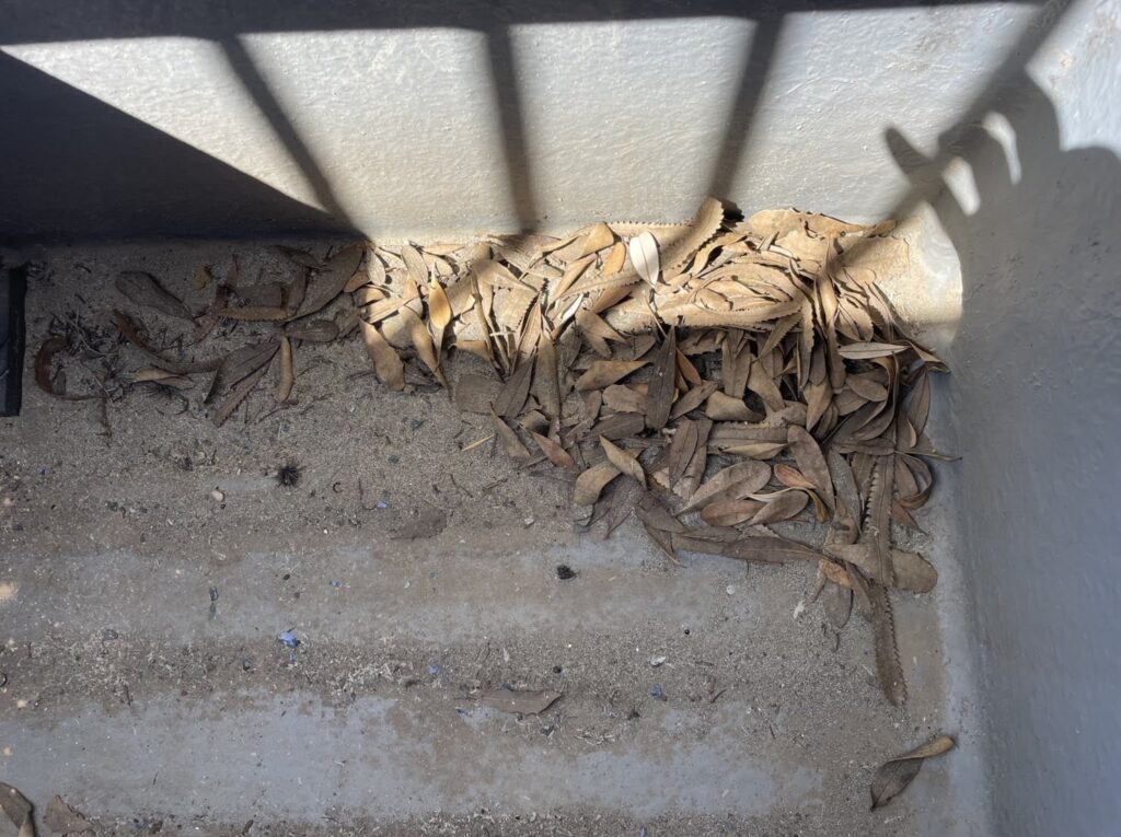翌日訪問して確認したところ、ルーフバルコニーのデッキ下が落ち葉で大変な事に成っていたのです。