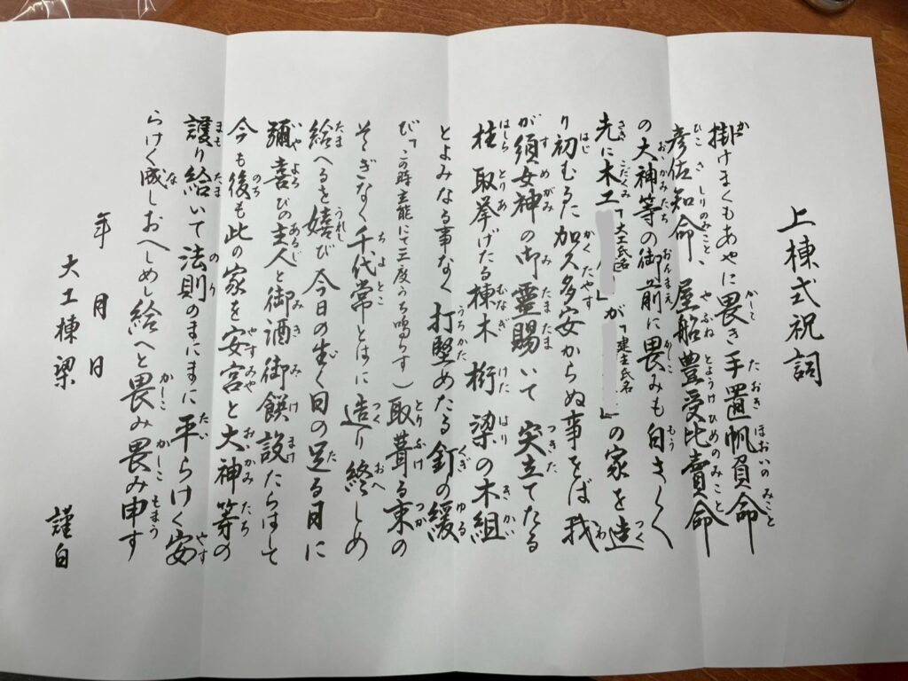 祝詞というのは、家が無事に棟まで組み上がったことへの喜びと感謝を神様へ捧げ、