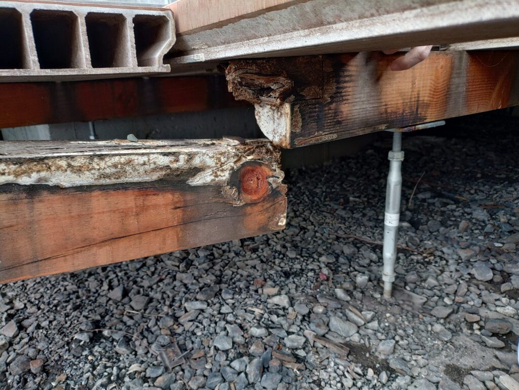 床を受けている部材の傷みは解体前に確認できましたが、床を剝してみたところ屋外の床下地としては