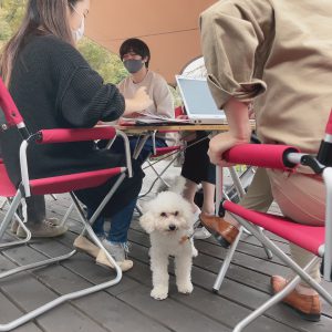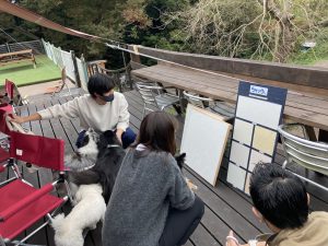 お客様とわんちゃん4匹とウッドデッキでお打ち合わせ