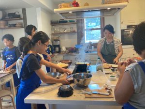 お二人の先生の指導のもと、生ハムの原木を勢いよく切る、ガスパチョを裏ごしする、パプリカの皮を剥く、などそれぞれが自分の担当をワイワイと進めています。