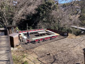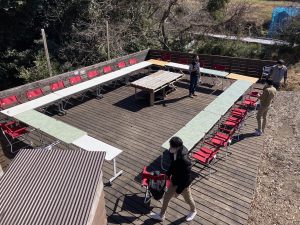 配置図をみながら、密にならないように下のウッドデッキに机と椅子をセット