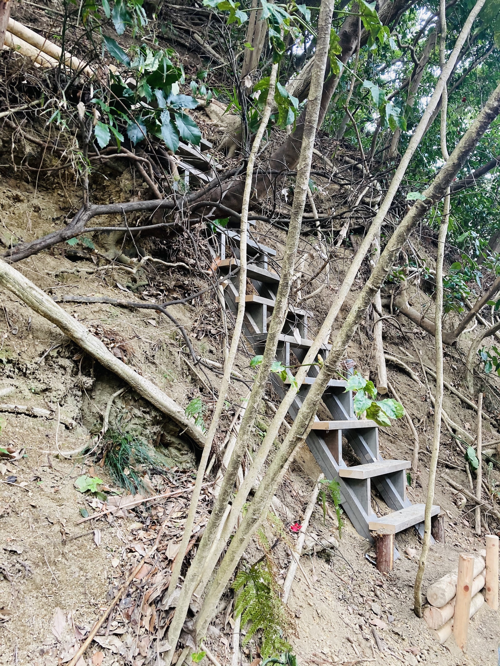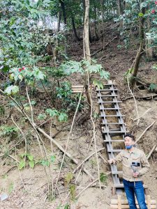 できたばっかりの階段をくだって、下まで降りて行きます。 川の上の飛び石を超えると、向かいの崖には梯子もかかっています!