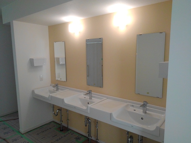 クロスを張り、天井、壁にお化粧をしていき、いよいよ照明器具、衛生器具、消火設備を付けていきます。
