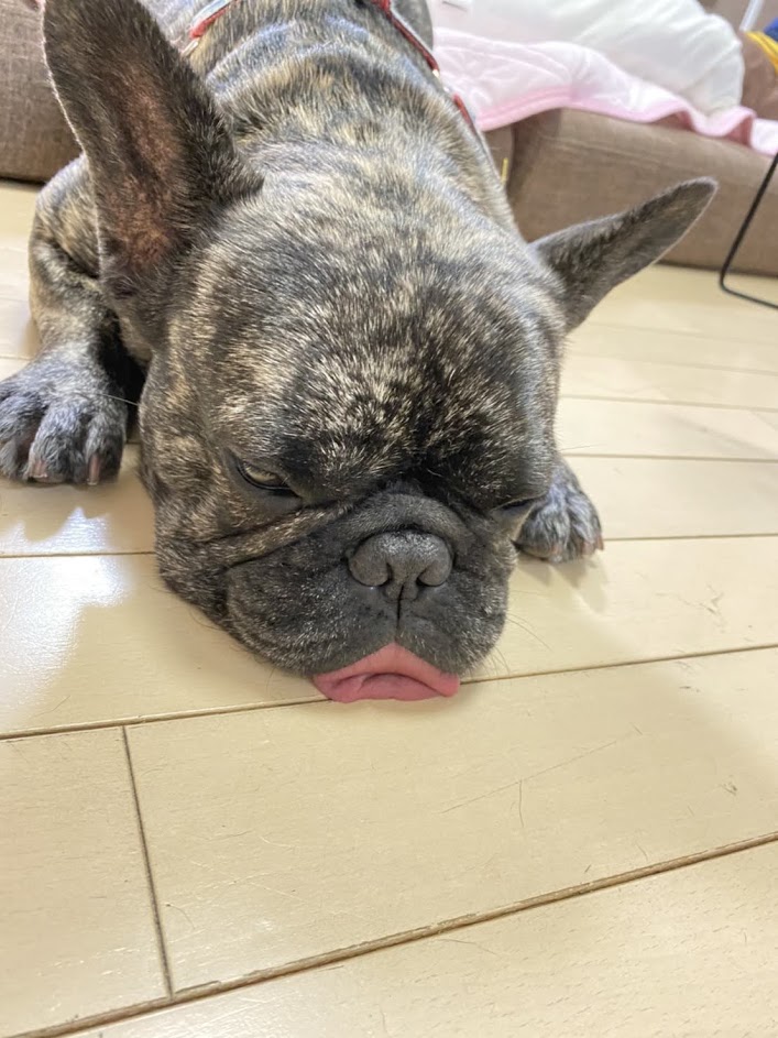 目は白目だし、ベロは床に付いて折り曲がっているし