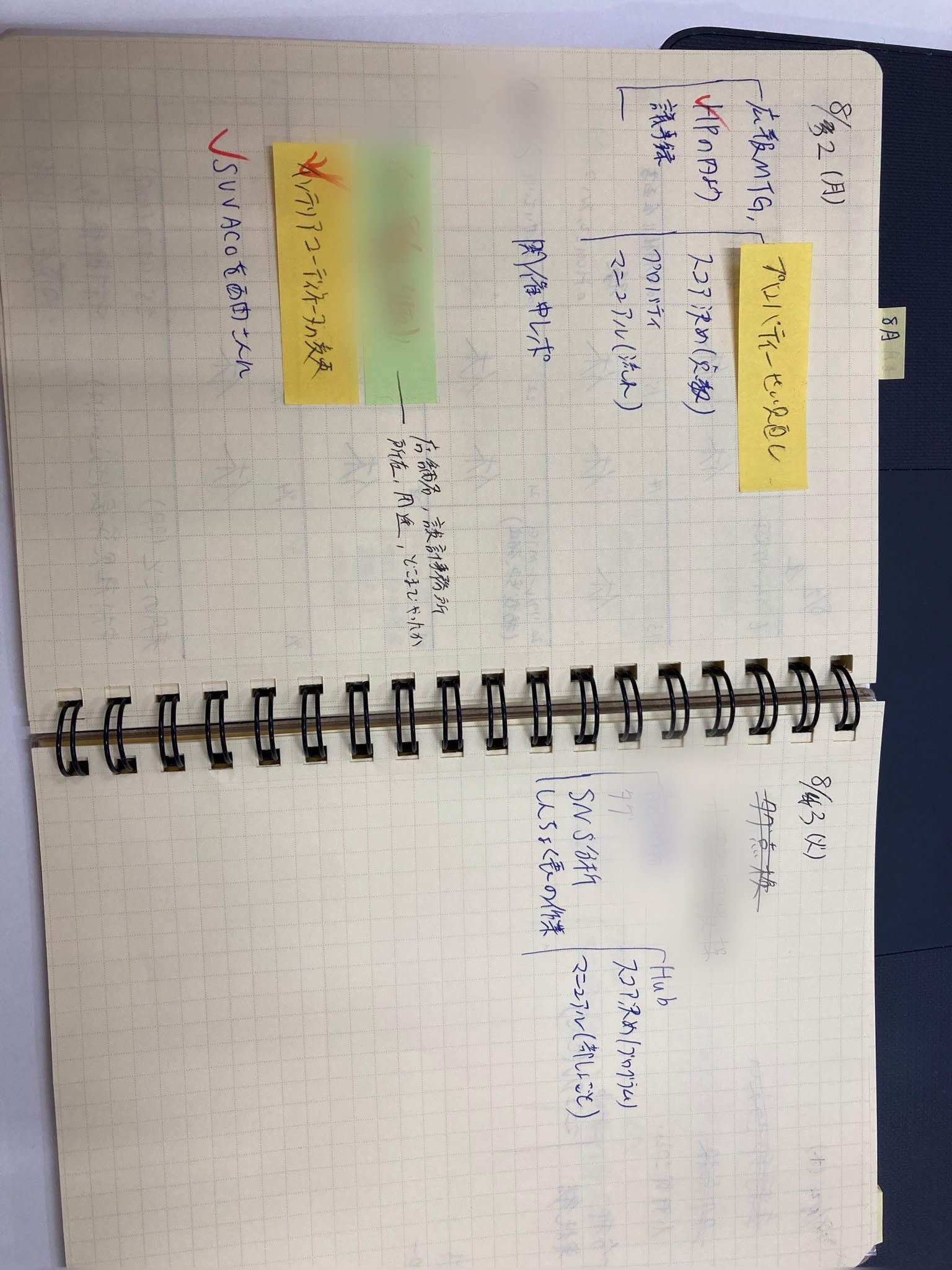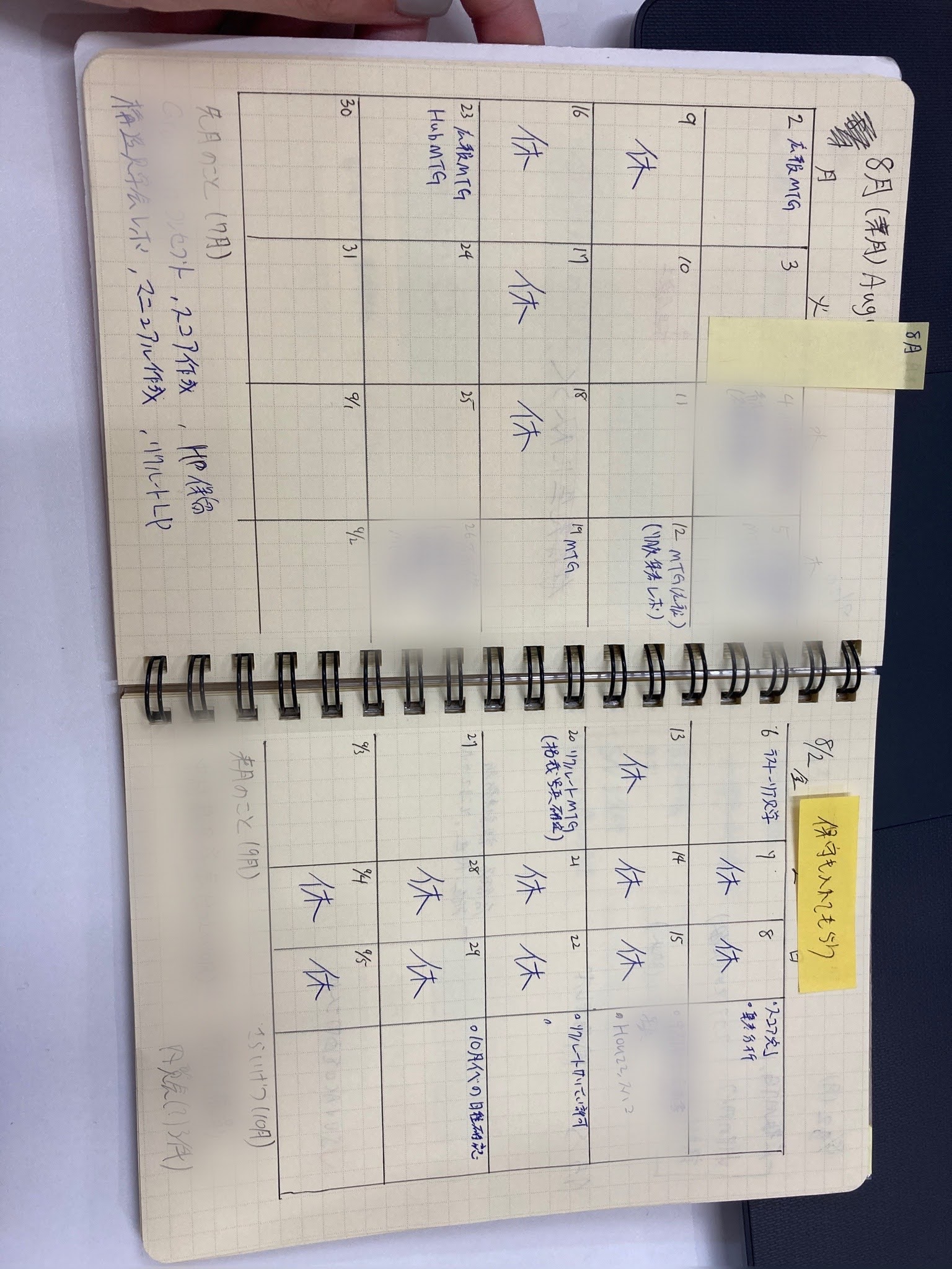 これは月間スケジュール。仕事用なので土日のスペースは小さめに取りました。下の余ったスペースは先月と来月と再来月の予定を書けるように。8月は休みが多いですね。