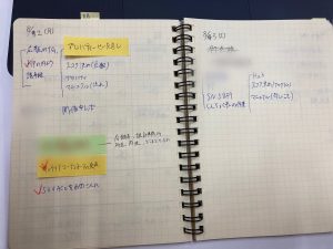 これは日別のページ。その日にやることをほぼすべて書き出します。ここに書いてあることに全部チェックが入ったら退勤する、というマイルールがあります。ちなみに私は毎日1時間の「自由時間」をスケジュールに入れています。この時間で突発的に発生した雑務をこなしたり、ブログを書いたりしています。あと、1時間業務時間が減る(表面的には)のですから気持ち的にも効率よくこなさなくては、と追い込みをかけることができます。(笑)