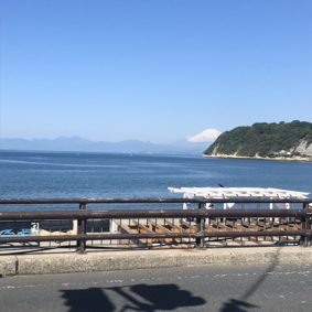 相模湾と海越しに富士山が見える。出た瞬間、「わ~富士山見えた~!!」と二人で叫び、スマホと次男お手製カメラでしばしの撮影タイム。