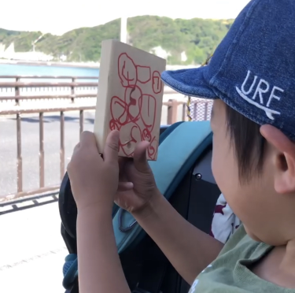 その一言を聞いた年長の次男が何やら作り始める。端材にマジックで描いて作ったお手製カメラ。