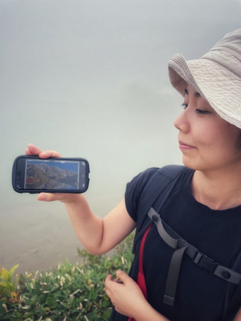 折り返しを決める前、一瞬だけ霧が晴れました。それまでは今どこにいるのか、どんな高さなのかが全く読めない中歩いていましたが、こんなところまで来たのか〜〜と驚きです。