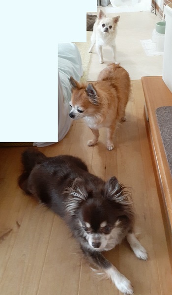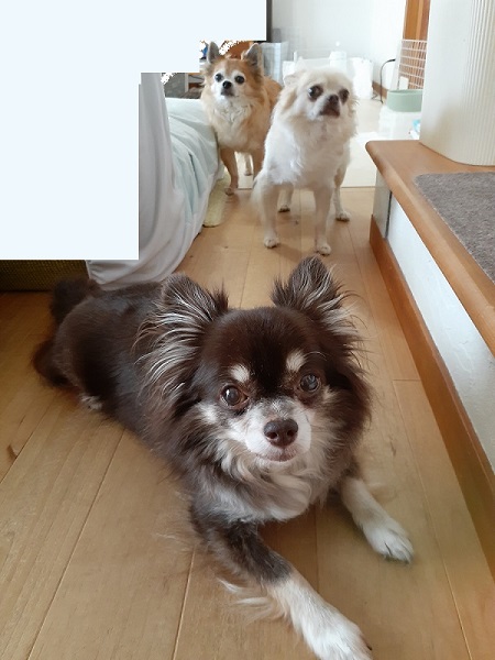 キッチンで飼い主がご飯の支度をしているとき、ちび達が集合しているのですが、兄さん’sは飼い主の行く方向を見て、ちゃんとよけたり、止まって待っていたりするんです。が!三番目は必ず!必ず!(2回言いましたよ)飼い主の動く方に「あわてて」動き出します。