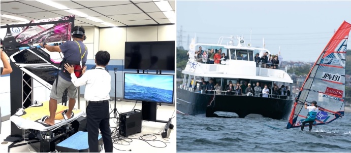 今大会ではギャラリーへのサービスもとても良くなっていて、ウインドサーフィン未体験の方向けにNTTが開発したウインドサーフィン・シュミレーターなるもので、VRゴーグルをつけることで選手の走りを体感できたり、実際に走っている選手からの高速データ送信による「リアルタイム体感」も可能とのこと、テクノロジー!驚きです。