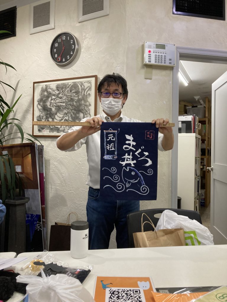 西田さんのマグロ丼の暖簾は、リフォームメンテナンス部の西田さんの描くマグロの絵に