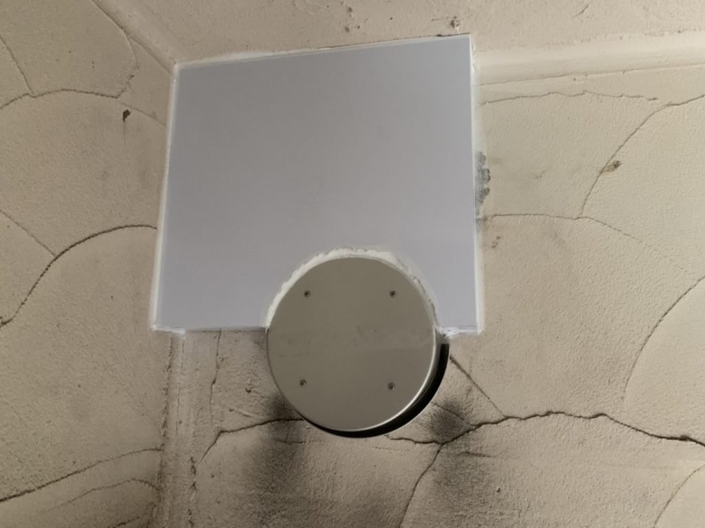 アパートの玄関先で狭いスペースに換気扇のキャップがありまして
